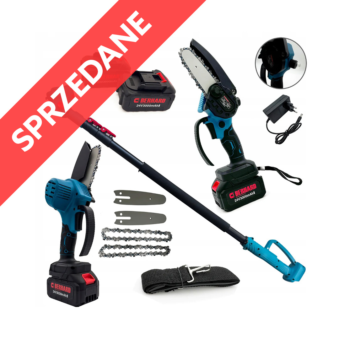 Akumulatorowa piła łańcuchowa na wysięgniku teleskopowym, przycinanie gałęzi na wysokości bez drabiny.