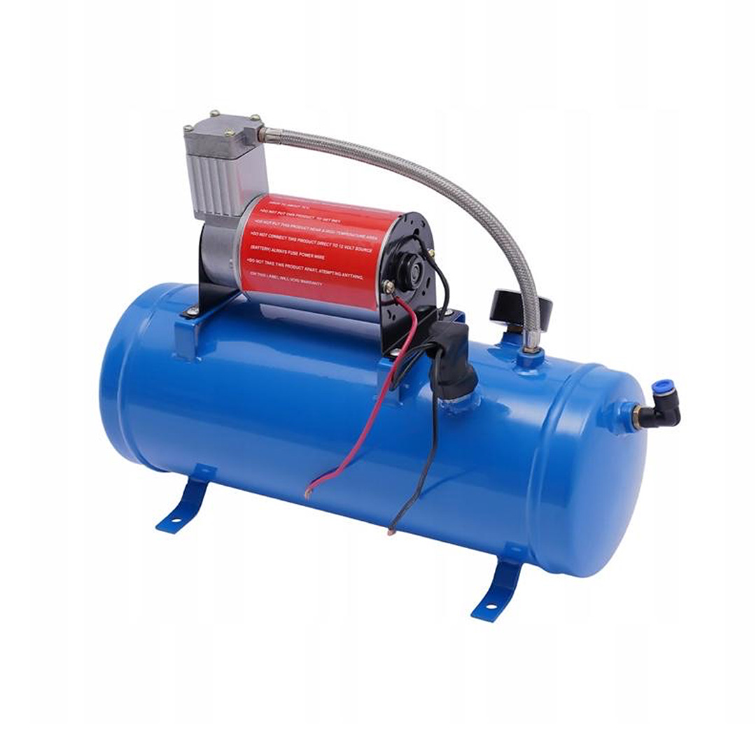 Kompaktowy kompresor powietrza zasilany napięciem 12V, ciśnienie robocze niezbędne do celów pneumatycznych.